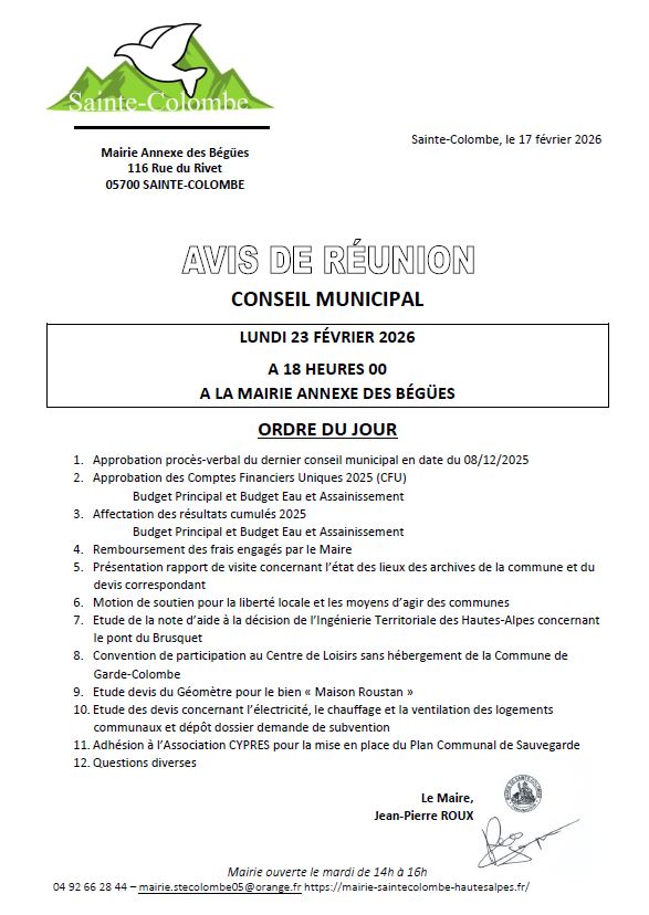 Avis de réunion – Conseil Municipal – Le 23 février 2026 à 18 heures